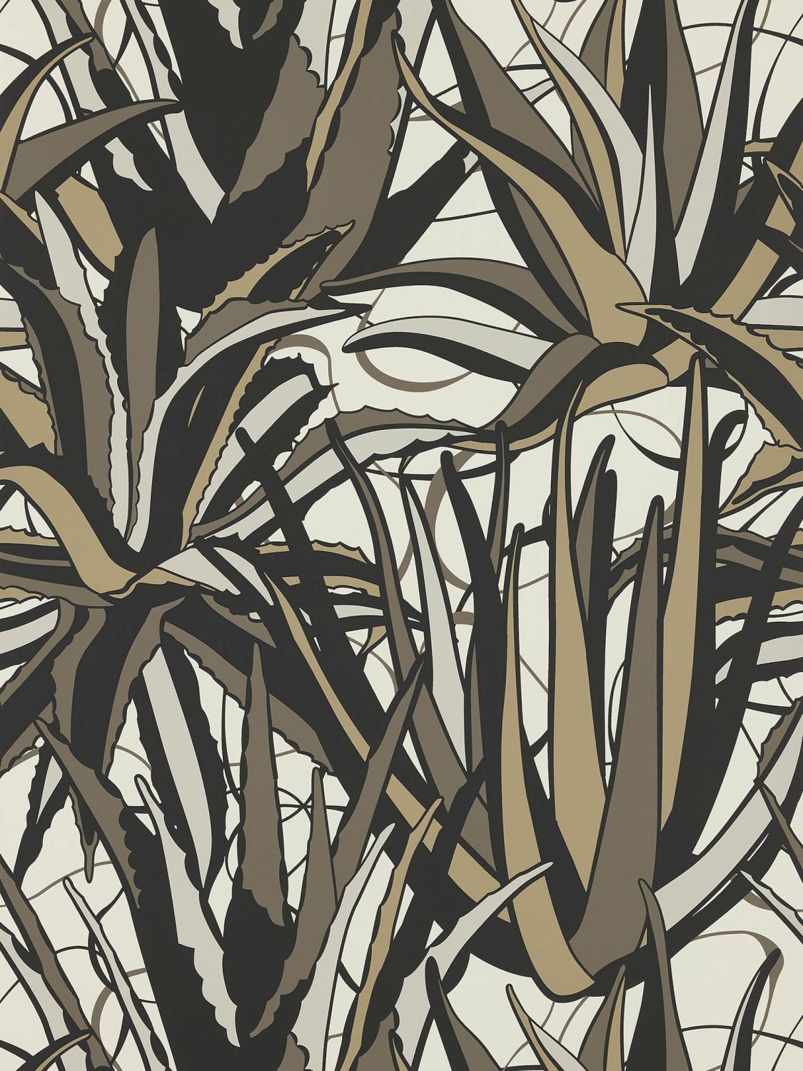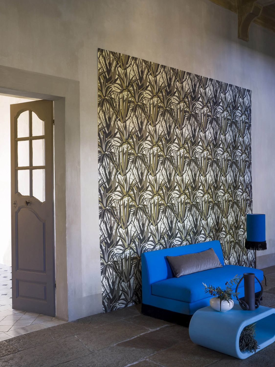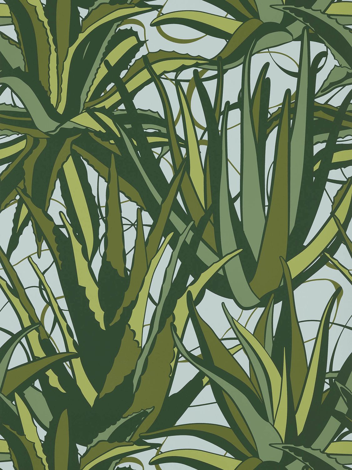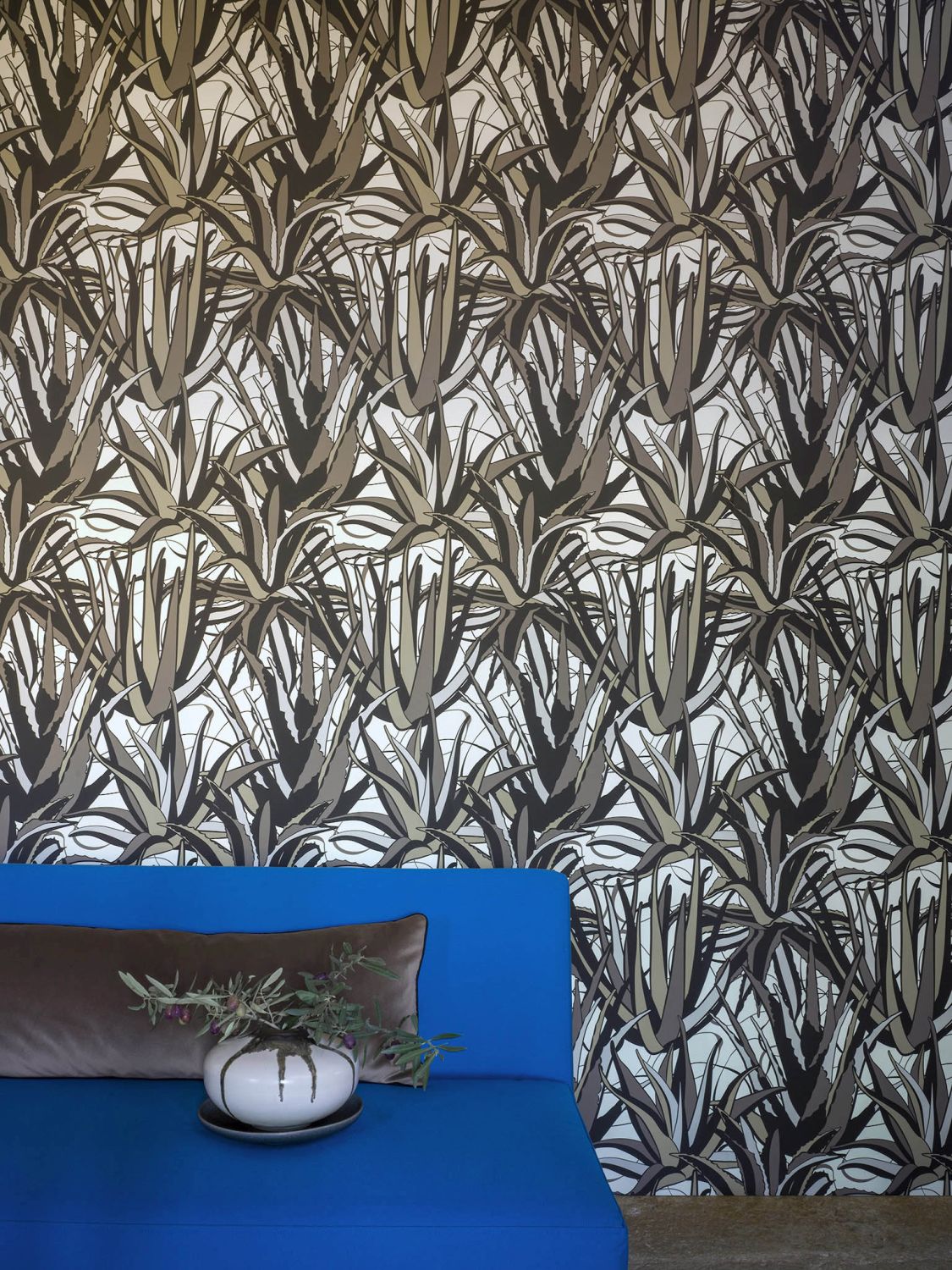 Графическая и современная версия средиземноморского сада, где переплетаются агавы и суккуленты. Традиционная матовая и гладкая печать придает цветам мягкость и элегантность.