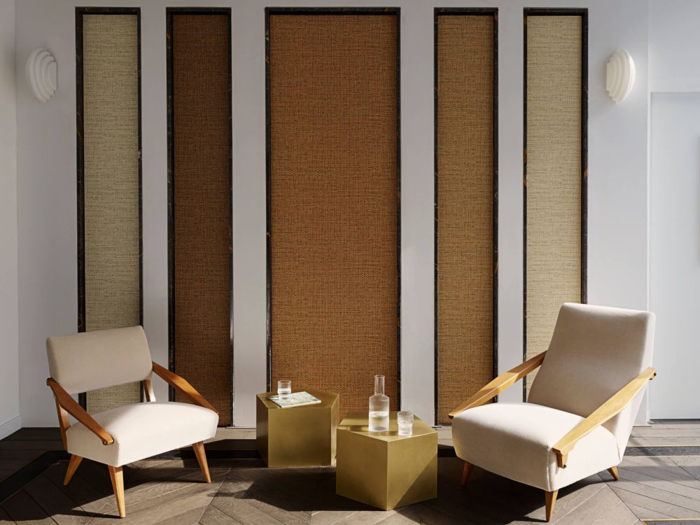 Вдохновленные тканью ручной работы, обои Natte в тон в тон воспроизводят нерегулярное, живое переплетение этого типа ткани. С помощью игры света и тени цвета этой естественной линии раскрывают ритмическую структуру этих обоев в тон-тон. Обои напечатаны с помощью валиков на тисненом виниле с плетеным кустарным рисунком и имеют матовую или переливающуюся отделку.