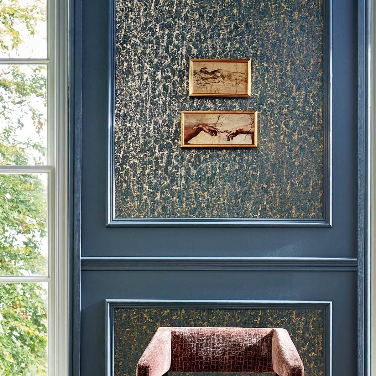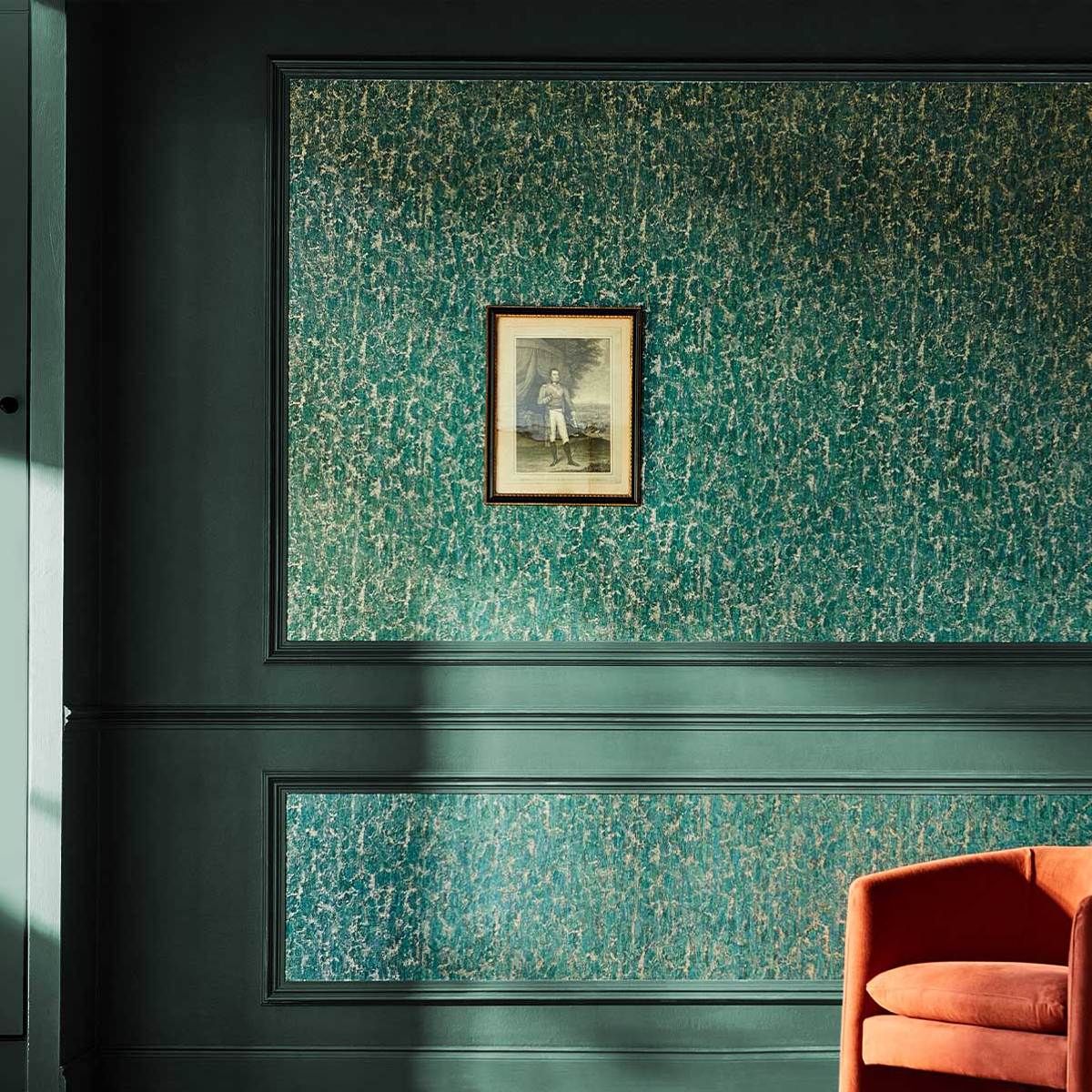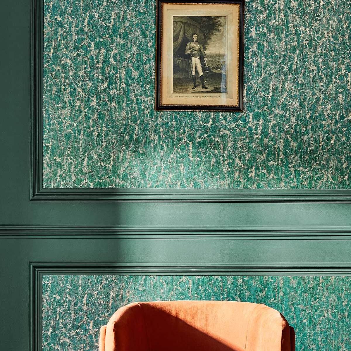 Moresque Glaze - с видом переливающейся глазури, насыщенные цвета и органический металлический эффект, видимый в этих обоях, представляют собой оригинальные методы, используемые для производства алхимической люстры.