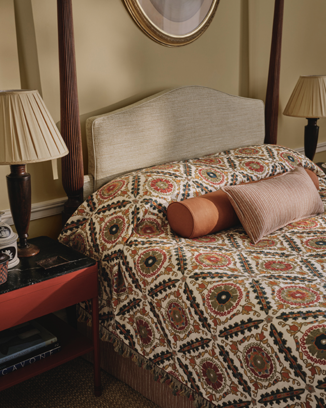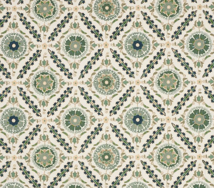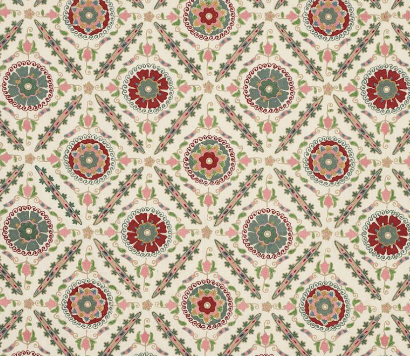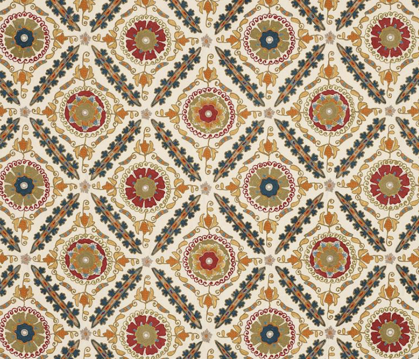 Эта вышивка с богатым узором, вдохновленная старинной тканью Suzani, сочетает в себе яркие цвета и тонкую вышивку, передающую дух оригинала. Классические круглые мотивы Suzani заключены в ромбовидную резьбу и подчеркнуты разноцветными деталями. Техники многослойной вышивки сочетают деликатные стежки с ручным тамбурным стежком, создавая богато текстурированную и визуально яркую ткань.