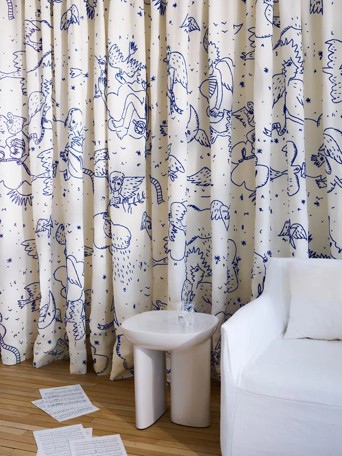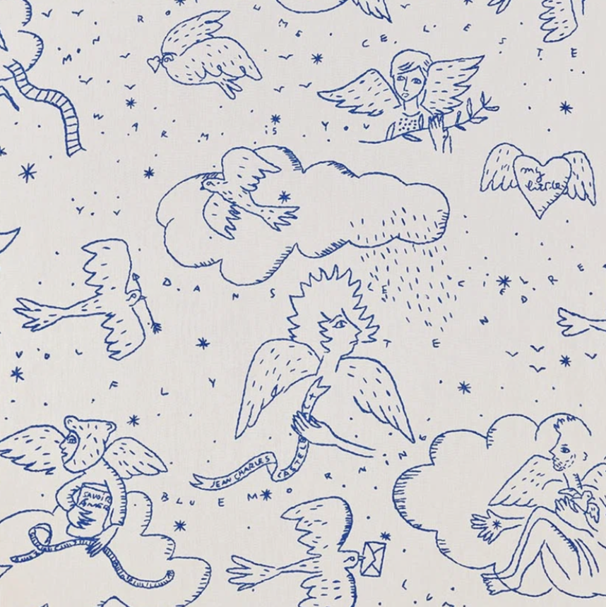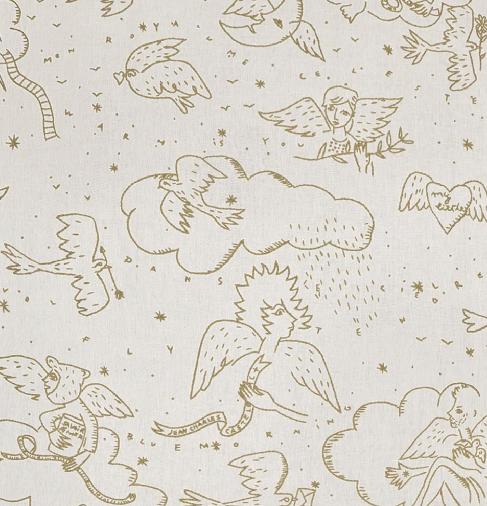 Ангелы делят небо с птицами. Они прячутся за облаками на рассвете, и звезды загораются, когда их сердца соприкасаются с сумерками. Этот дизайн напоминает великую классику французского стиля: the toile de Jouy. Синий для рассвета, золотой для сумерек. Этот дизайн вышит вручную хлопчатобумажной пряжей на льне.