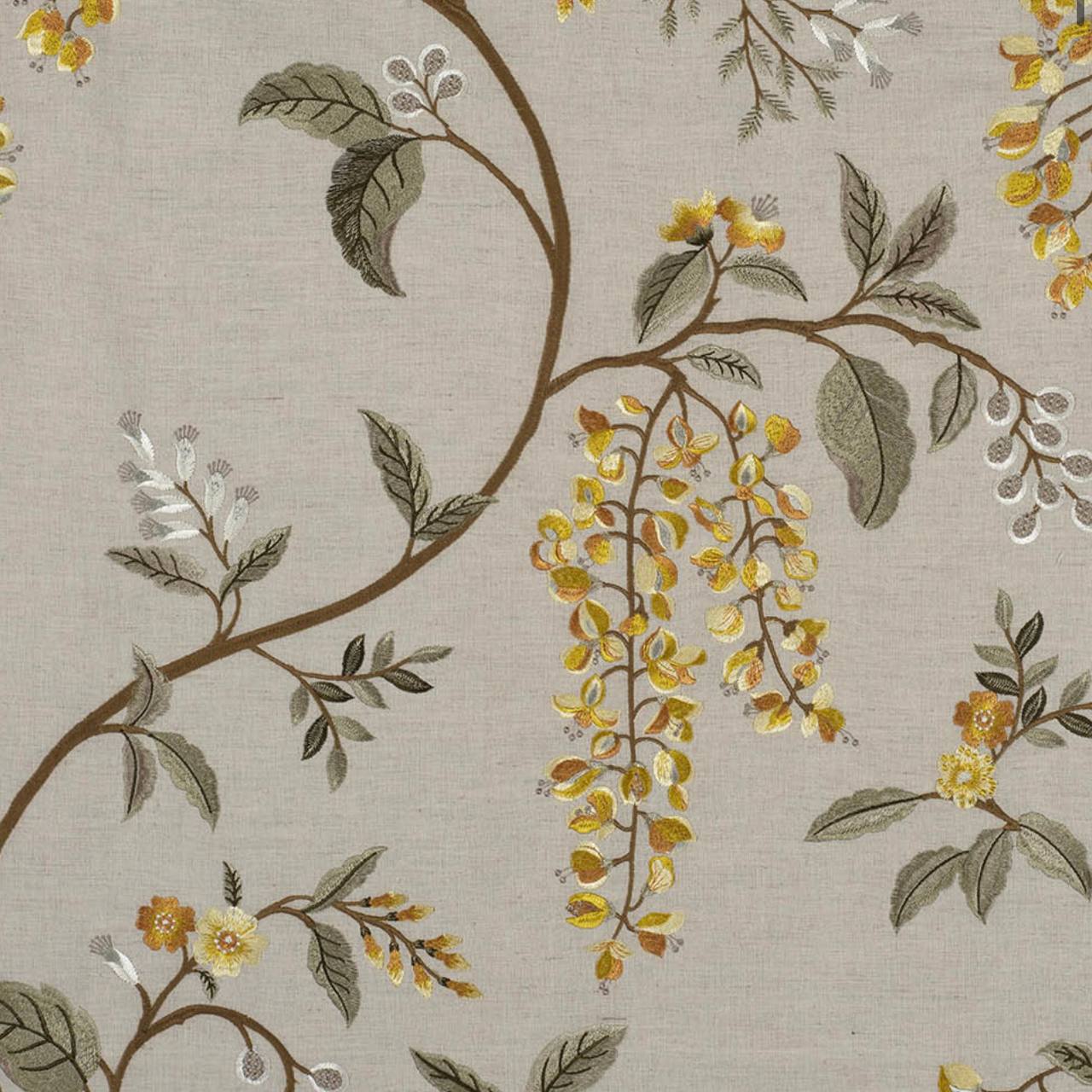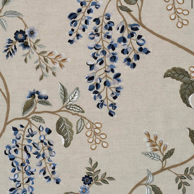 Замысловатая льняная вышивка, изображающая цветочный след глицинии в полном цвету. Этот впечатляющий дизайн способен преобразить интерьеры с его пышной зеленью и каскадными цветами. Обладает богатым набором цветов и текстур на льняно-хлопчатобумажной поверхности. Wisteria Vine сочетает в себе традиционную цветочную элегантность с современным украском.